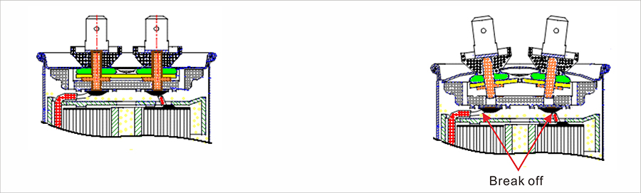 This structure is an overpressure separator. When the capacitor breakdown due to overheating, overload or near life, the release of a large amount of gas causes the air pressure in the capacitor shell to rise rapidly and the top cover is bent upwardly. When the expansion exceeds the limit, the internal cable will be quickly separated, the fault components completely cut off. The advantages are as follows: