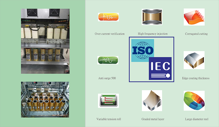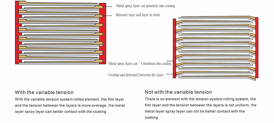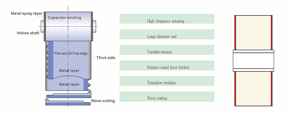 ■ With specially developed with the variable tension rolling system, so that the film layer and the tension between the layers more uniform, the metal spray layer can better contact with the coating, thereby enhancing the capacitor surge current capability