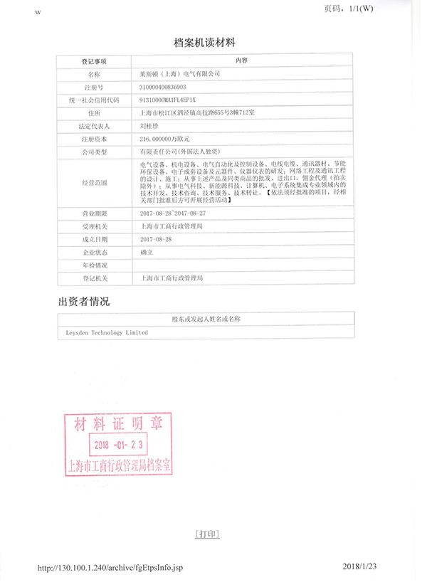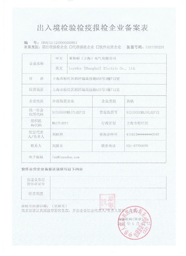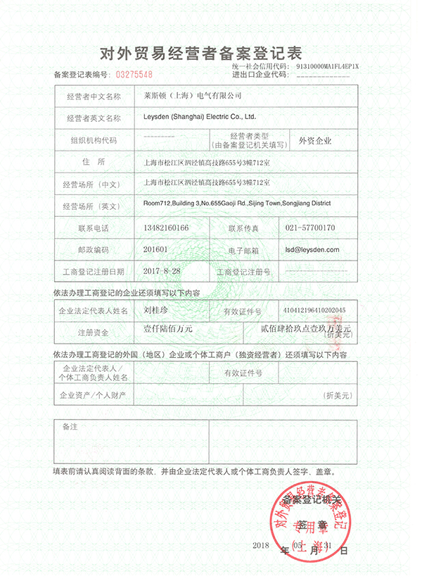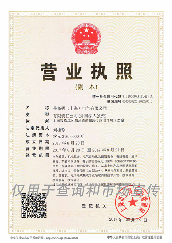 由于多数同行品牌公司均在各个区县注册,而LEYSDEN驻中国公司是在上海市工商总局注册,引起合作伙伴的情况咨询,近期莱斯顿电气对外展示了上海市工商总局颁发的营业执照和机读档案,并展示进出口权证明等资质文件供广大合作伙伴查询!