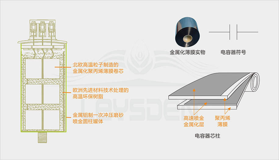 低压电容器结构分为三个部分,一是北欧高温粒子制造的金属化聚丙烯薄膜卷芯,二是欧洲先进材料技术处理的高温环保树脂,三是金属铝制一次冲压磨砂喷金圆柱罐体。简单地说低压电容器主要由导电的芯子、散热的填充物和壳体组成,向客户介绍电容器就围绕这三部分来介绍就行了。