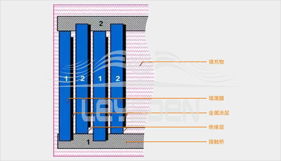 ▶平行的1#与2#金属导电层中间夹着一层聚丙烯薄膜。